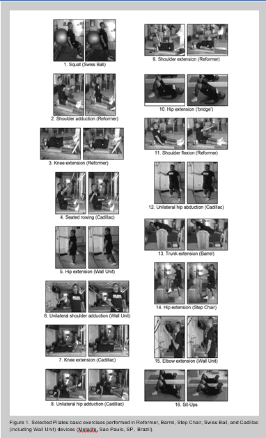 Pilates and Control Sessions. All Pilates sessions were ministered by the same trained instructor, using Reformer, Barrel, Step Chair, Swiss Ball, and Cadillac (including Wall Unit) devices (Metalife, Sao Paulo, SP, Brazil) and included: (a) warm-up including stretching and calisthenics for upper and lower body (8–10 minutes); and (b) Pilates exercises (basic) for the major muscle groups, as illustrated in Figure 1. A single set of 10 repetitions was performed for each exercise in a circuit format (approximately 50 minutes). Heart rate was continu- ously measured by a heart monitor, and the rate of perceived exertion was assessed after each exercise and at the end of the Pilates session, to maintain a constant intensity corresponding to scores 3–5 in the OMNI-RES Scale (27). The training impulse (TRIMP) in each session was calculated to assure that exercise intensity and volume were similar across subjects (2). TRIMP integrates in a single variable; both intensity and volume of training, being determined by multiplying the total duration of exercise bout (TD) by average heart rate reserve (HRR) as follows: (a) TRIMP, a.u. (men) = TD 3 HRR 3