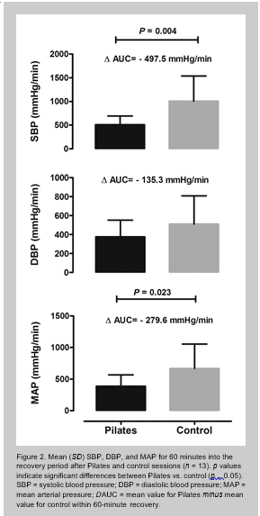 60 minutes after experimental sessions. As for SBP and MAP, AUCs were smaller after Pilates vs. nonexercise con- trol sessions. In comparison with nonexercise control ses- sions, SBP and MAP were lowered after Pilates by 27.4 6