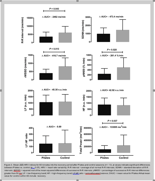 Figure 3. Mean (SD) HRV indices for 60 minutes into the recovery period after Pilates and control sessions (n = 13). p values indicate significant differences between Pilates vs. control (p , 0.05). HRV = heart rate variability; R-R interval = average of all normal R-R intervals; SDNN = standard deviation of R-R intervals; rMSSD = squared root of the mean squared differences of successive R-R intervals; pNN50 = percentage of successive R-R interval differences greater than 50 ms; LF = low-frequency band; HF = high-frequency band; LF:HF ratio = sympathovagal balance; DAUC = mean value for Pilates minus mean value for control within 60-minute recovery.